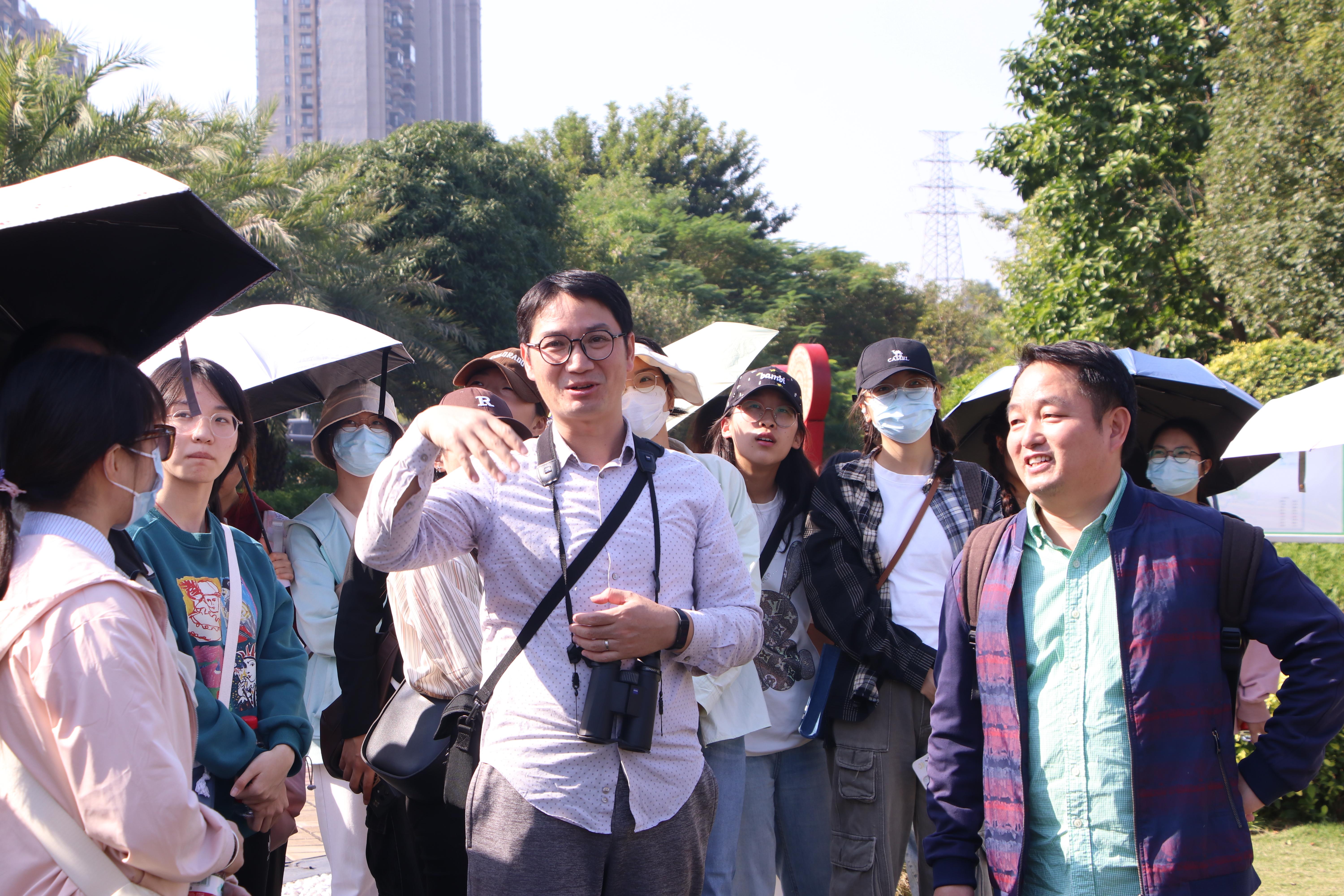 那考河湿地公园清澈的河水倒映着岸边的绿树,鱼翔浅底,水鸟嬉戏,这幅生机盎然的图景,诉说着南宁沂水而居的美好生活。活动中,罗应华、尤业明两位老师根据那考河湿地公园观景路线图,以湿地植物、湿地设施为切入点进行了详细的讲解,使同学们深入学习了矮生苦草、泽泻、金钱草、美人蕉、睡莲等沿边湿地景观植物的生态特性、生存环境、保护措施等专业知识。罗应华老师还向同学们讲解净水梯田的原理,并介绍了“海绵城市”的建设理念、那考河湿地公园中应用的污水治理体系,沿着那考河湿地公园栈道逐级而下,一侧是独具特色的“净水梯田”,另一侧是草木葱茏的湿地花田。从净水厂出来的水,先后流经梯田、湿地、水塘,最后才汇入那考河。