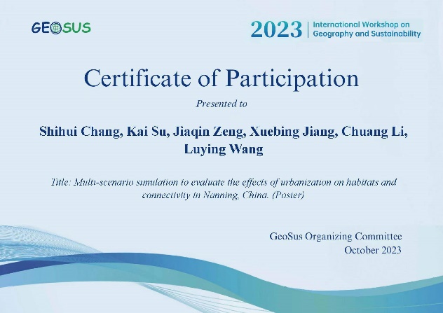 我院研究生常士慧受邀参加2023 GEOSUS,以“Multi-scenario simulation to evaluate the effects of urbanization on habitats and connectivity in Nanning, China”为题进行墙报演讲,与参会人员开展了深入交流与讨论。研有所获,我院研究生常士慧在墙报评比中获得“Best Poster Award”(最佳墙报奖)并登上颁奖台与颁奖嘉宾合影留念。