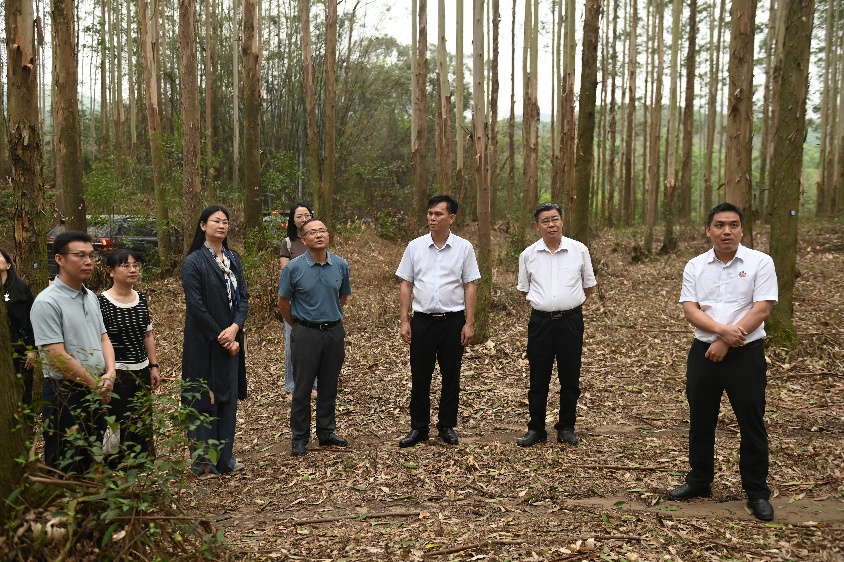 4月24日,在派阳山林场党委书记彭家昆等负责人陪同下,调研组深入林业生产一线,先后考察了桉树四代良种科技示范林、桐棉松国家储备林产业示范区、桐棉松大径材展示区等特色区域,听取技术人员系统讲解不同树种的良种选育技术体系、全周期精准培育模式以及林场经营策略及取得的成果。座谈会上,双方围绕"深化科教融合、推进产教协同、服务现代林业、助力乡村振兴"主题展开深度交流,黄里云书记代表学院感谢派阳山林场对学院的大力支持,她希望双方通过联建共建、科教产教的双促双融,进一步加强合作,建立联合攻关机制、促进人才培养交流。