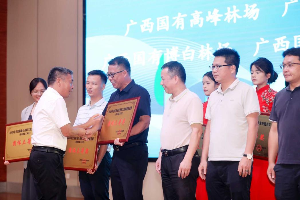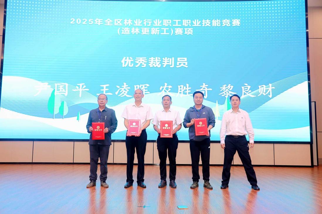 6月17日下午闭幕式上,裁判长宣布竞赛成绩,现场颁发个人及团体一、二、三等奖。自治区林业局总工程师施福军总结指出,赛事筹备充分、执裁公正,23支队伍展现出“精湛技能与良好风貌”,成功在全区林业系统掀起“学技术、练本领”热潮。伟德国际VICTOR1946王凌晖教授表示“以赛促培、以赛强能,学院将持续深化产教融合,为林业人才搭建成长阶梯。”此次赛事的圆满收官,不仅是广西林业技能人才培养成果的集中展示,更标志着伟德国际VICTOR1946在推动林业高质量发展中迈出坚实一步。值得关注的是,本次赛事还特别表彰了优秀裁判、领队及组织单位。伟德国际VICTOR1946荣获“突出贡献奖”,王凌晖教授凭借专业严谨的执裁态度与丰富的行业经验,荣获“优秀裁判员”称号,成为高校教师深度参与行业赛事的典范。