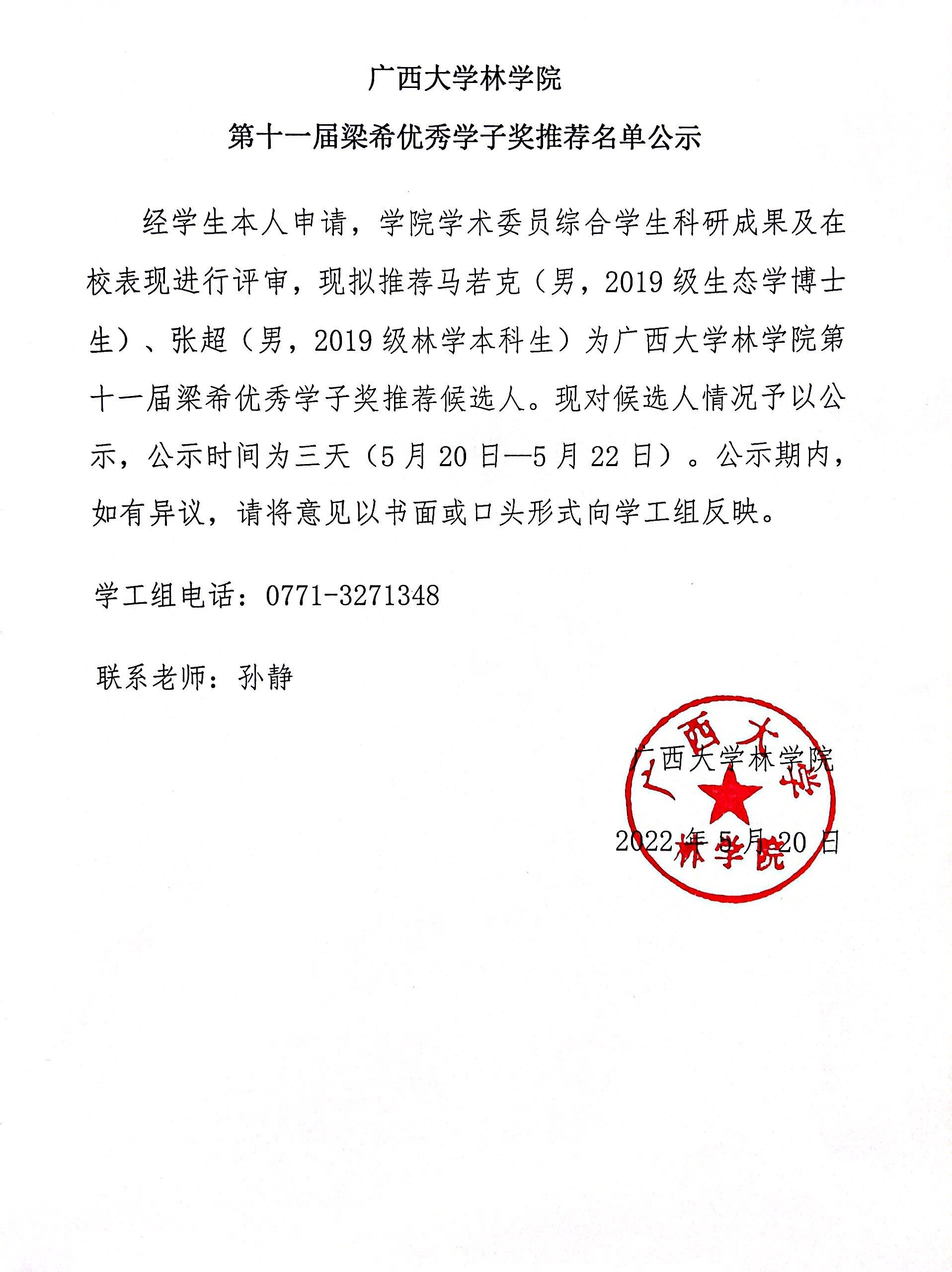 伟德国际VICTOR1946第十一届梁希优秀学子奖推荐名单公示