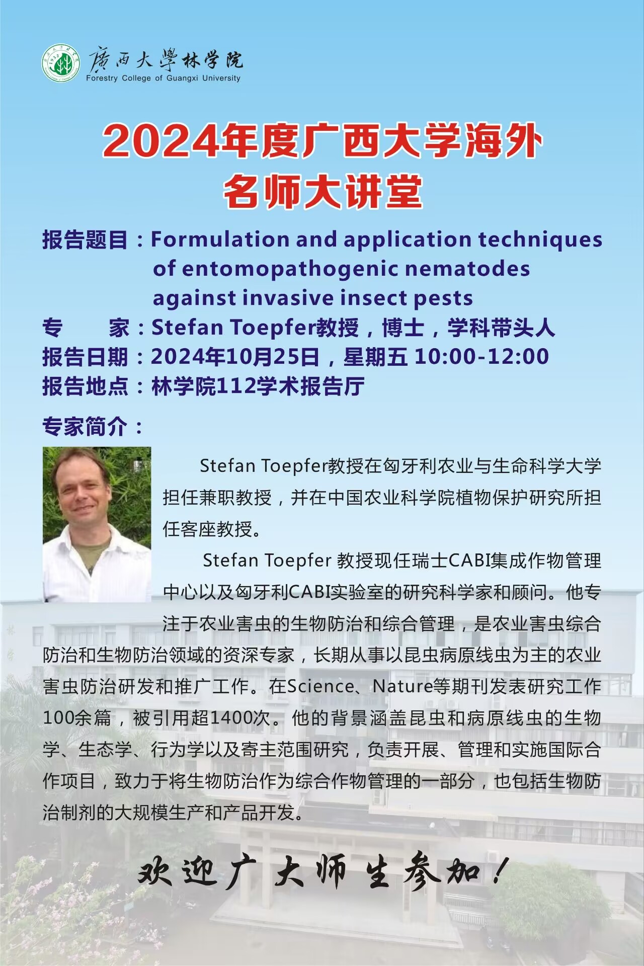 学术报告(2024年度伟德betvlctor1946源于英国海外名师大讲堂):Formulation and application techniques of entomopathogenic nematodes against invasive insect pests