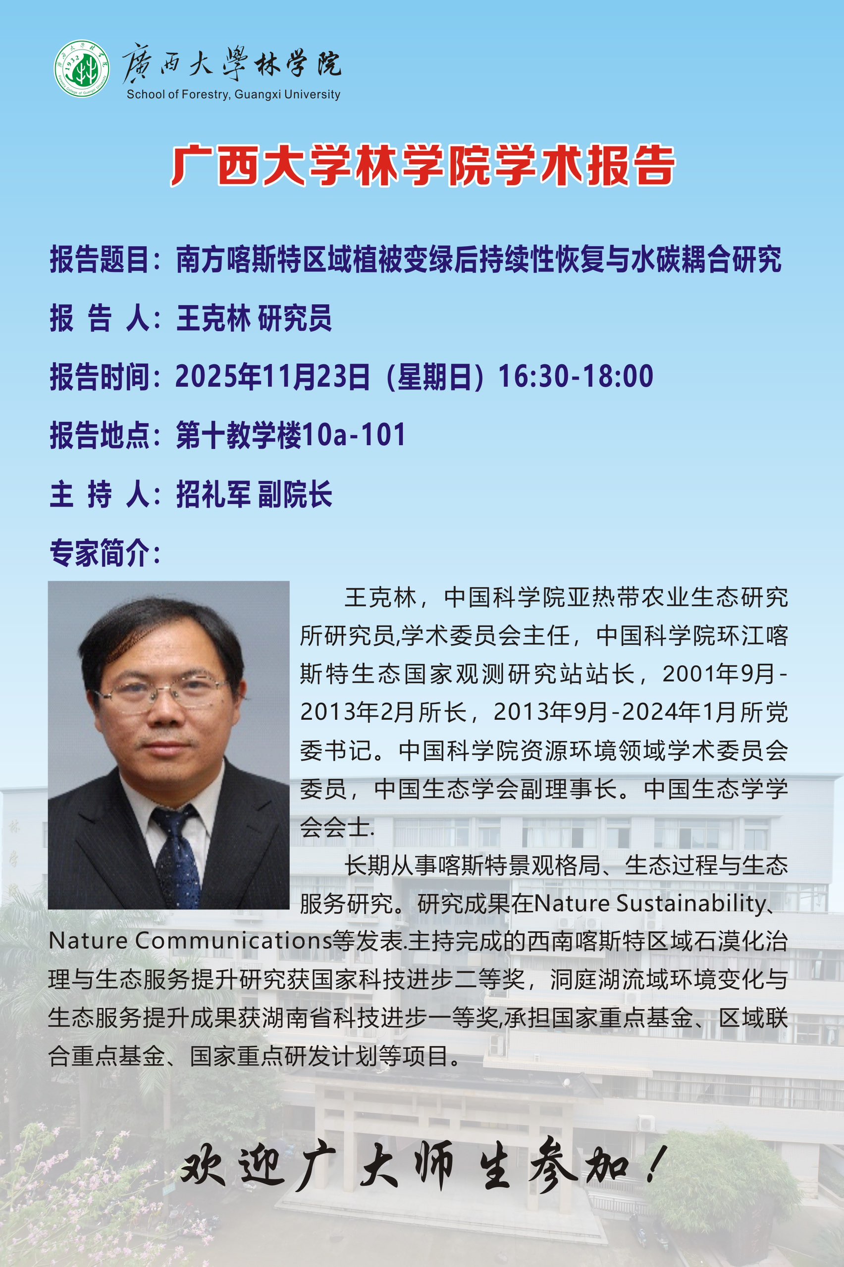 学术报告:南方喀斯特区域植被变绿后持续性恢复与水碳耦合研究