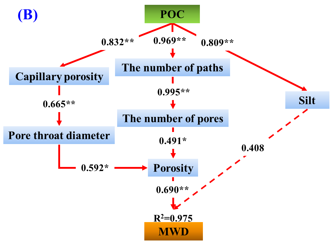 对此,我院研究团队提出科学假设:喀斯特地区不同土地利用类型下土壤胶结物质含量可能通过影响其孔隙内部结构,进一步造成团聚体稳定性差异。为验证这一假设,研究团队通过CT扫描耕地、果园、人工林、灌木林以及次生林5种最典型土地利用类型的土壤团聚体内部孔隙结构,开展不同土地利用类型中土壤主要胶结物质包括有机碳、团聚体孔隙结构以及团聚体稳定性特征分析,并结合结构方程模型(SEM)对各变量间的耦合关系进行定量分析(图1)。