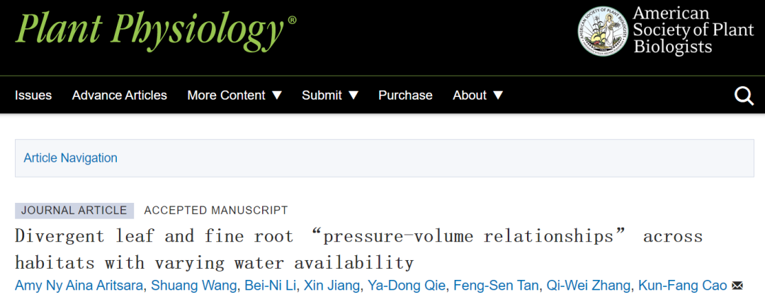 近日,伟德betvlctor1946源于英国“亚热带农业资源保护与利用国家重点实验室”植物生理生态与进化课题组曹坤芳教授团队在Plant Physiology发表了题为Divergent leaf and fine root“pressure-volume relationships”across habitats with varying water availability的研究论文,揭示了不同生境木本植物水力“熔断”机制。