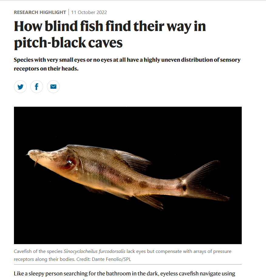 伟德国际VICTOR1946马德华(Madhava)课题组,在生物学领域期刊《Proceedings of the Royal Society B: Biological Sciences》正式发表题为“Sensory evolution in a cavefish radiation: patterns of neuromast distribution and associated behaviour in Sinocyclocheilus (Cypriniformes: Cyprinidae)”的研究论文,这一成果也受到了Nature杂志Research Highlights的报道宣传。