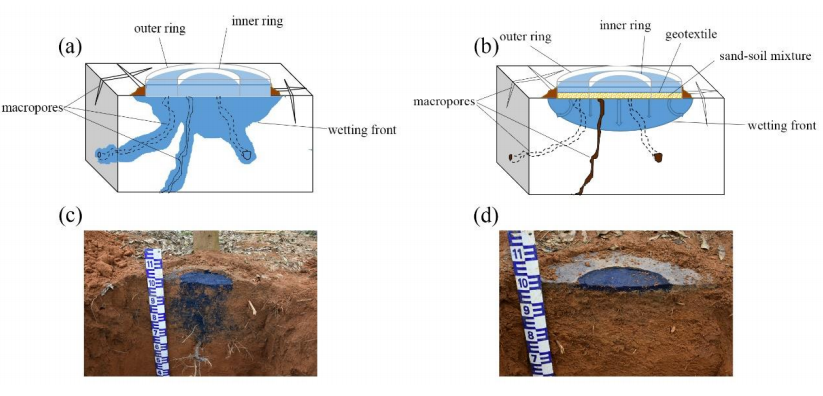 图1土壤总入渗测量过程示意图(a)及其实测土壤剖面图(c)与土壤基质入渗测量过程示意图(b)及其实测土壤剖面图(d)