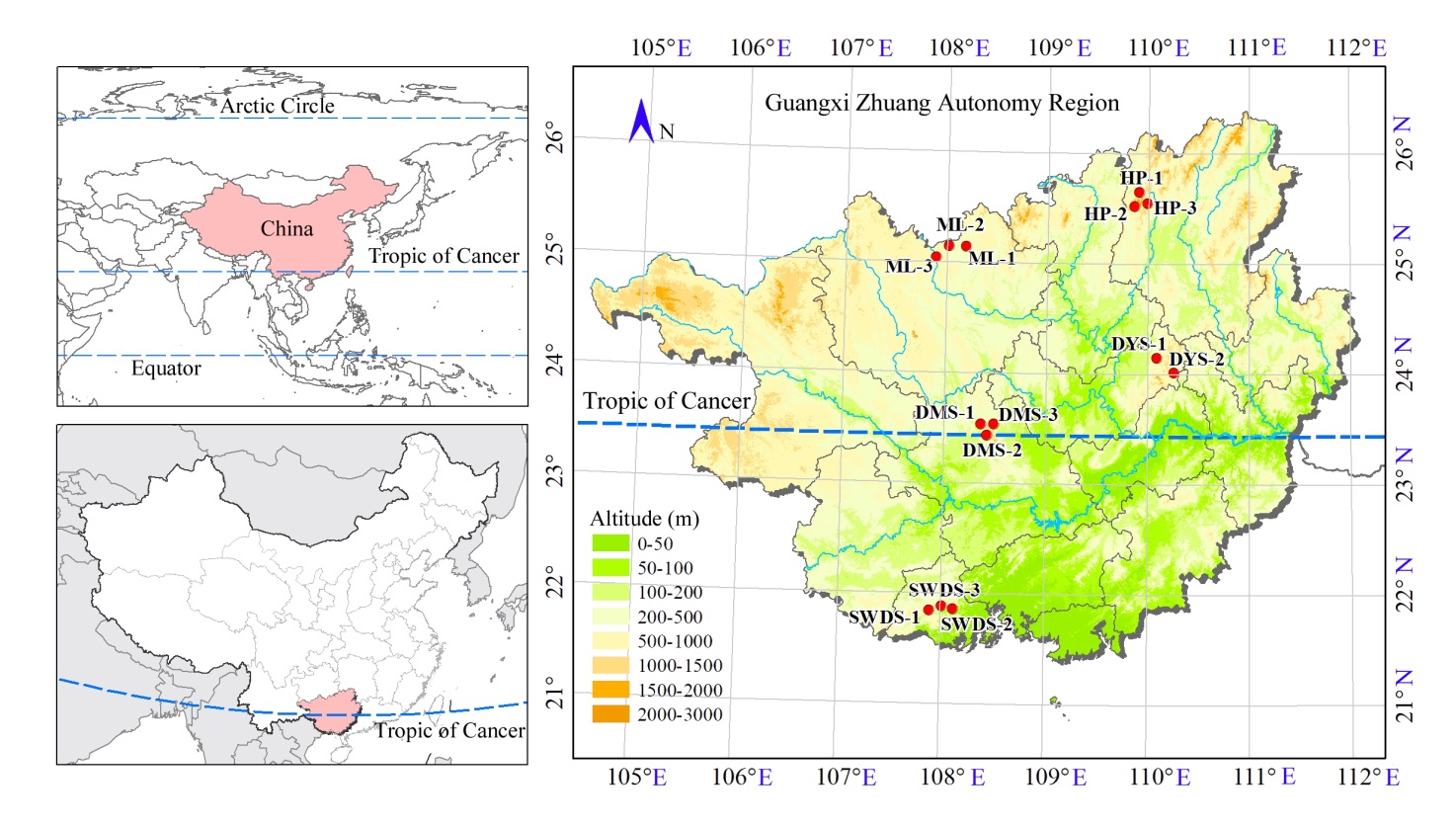 图1:样地在中国广西壮族自治区国家级自然保护区内的分布,北回归线横穿广西壮族自治区中部。