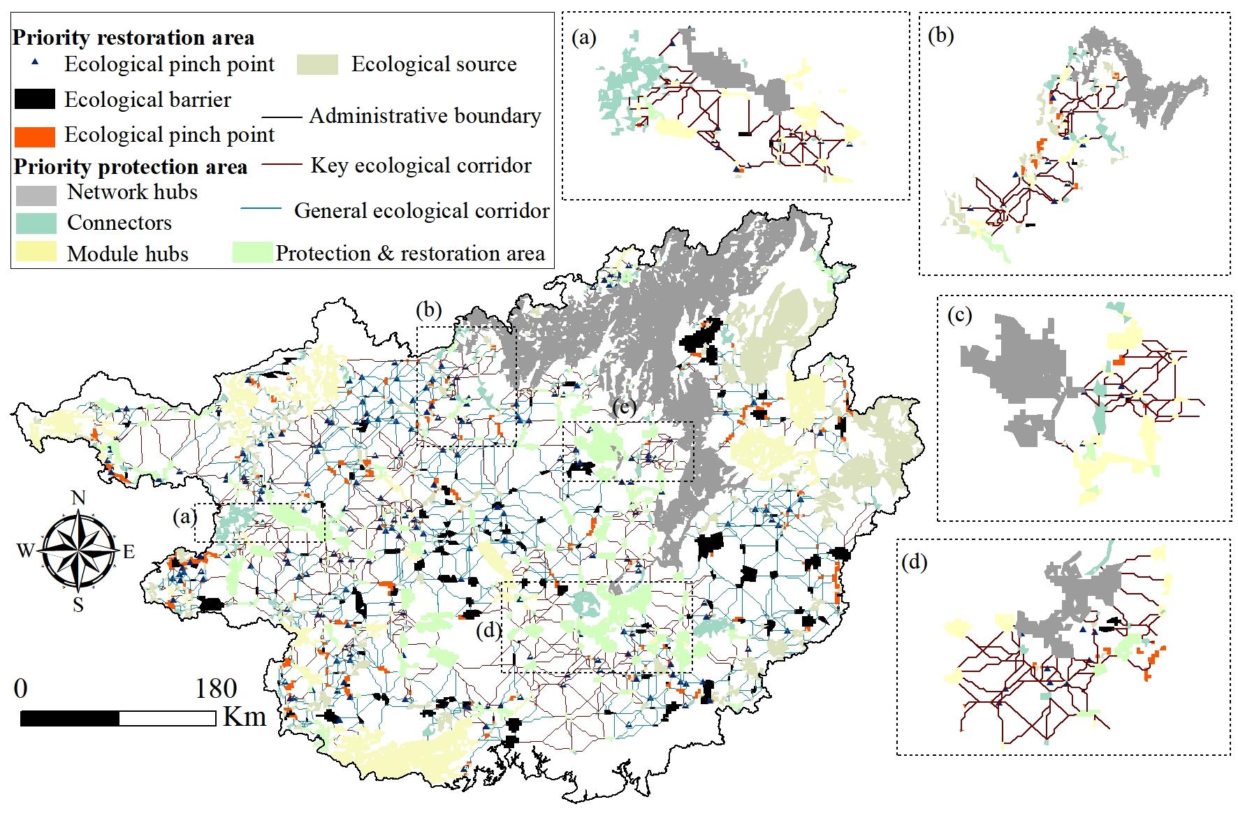 识别和保护生态资产的关键场所,改善空间连通性和可达性是保护生态多样性的重要措施。我院研究团队以广西为研究区域,基于生态系统生产总值(GEP)识别生态源,结合MCR模型构建初始生态网络。利用电路理论提取初始生态网络的内部缺陷,根据复杂网络分析确定具有明确空间位置的恢复和保护优先区域,并对优化前后的网络性能进行全面评价。结果表明:识别出456个初始生态源和1219个生态廊道,形成了广西的初始生态网络。基于电路理论,提取了168个生态屏障、83个生态夹点和71个生态垫脚石进行网络优化。优化后共有778个生态源,总面积73950.56 km2;2078条生态廊道,总长23922.07 km。优化后的结构GEP较未优化的结构提高了13.33%。保护的优先区域呈大面积集中连片分布,附带的GEP达到1180亿美元,占优化后生态源地附带总GEP的72%。恢复的优先区域呈小斑块较零散的分布,附带了192.7亿美元的GEP。优化后的生态网络的稳健性和连通性明显提高。该研究试图识别生态资产的关键场所和具有真实空间位置的恢复和保护优先区域,为区域生态网络的优化和实施提供参考。
