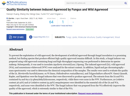 本研究为开发高效结香菌剂,提高沉香产量及品质促进人工沉香产业发展具有一定意义。相关研究成果以“Quality Similarity between Induced Agarwood by Fungus and Wild Agarwood”为题发表在《Journal of Agricultural and Food Chemistry》(农林科学1区TOP期刊,IF=6.1,封面文章)。我院林学硕士研究生黄满勤为论文的第一作者,符韵林教授为通讯作者,该研究得到国家自然科学基金面上项目(32171702)资助。