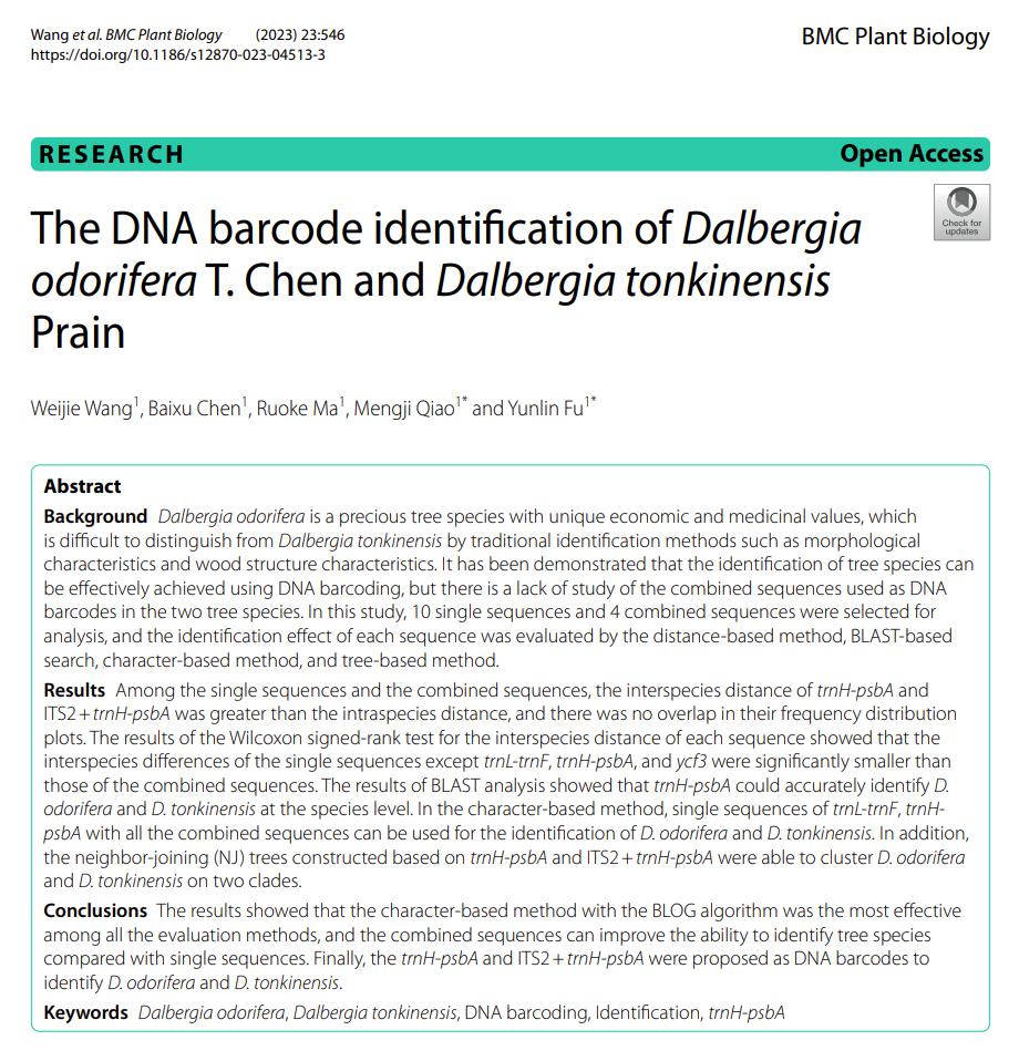 近日,伟德国际VICTOR1946符韵林教授团队在木材的DNA条形码鉴定方面的研究成果《The DNA barcode identification of Dalbergia odoriferaT. Chenand Dalbergia tonkinensisPrain》(降香黄檀与东京黄檀的DNA条形码鉴定),发表于生物学领域期刊BMCPlant Biology(中国科学院二区,IF=5.3)。我院生态学博士研究生王巍洁为论文的第一作者,乔梦吉讲师和符韵林教授为通讯作者。该研究得到了国家自然科学基金(31870540)的支持。