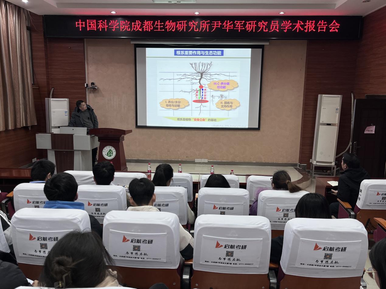 2023年12月24日至25日,中国科学院成都生物研究所尹华军研究员受邀到我院开展学术交流活动,并作了题为“高寒森林根际生态过程研究”的学术报告。本次学术报告会由我院副院长尤业明老师主持,学院相关教师、研究生和本科生共计100余人聆听了学术报告。