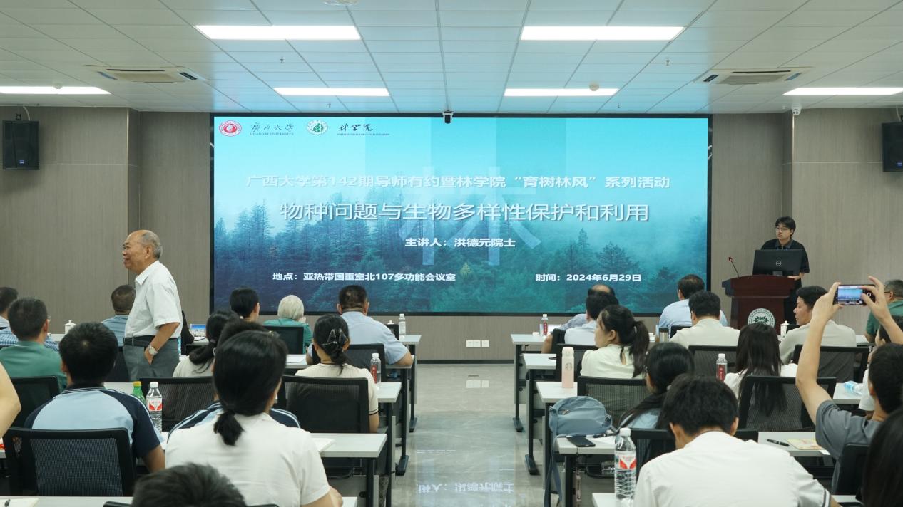 6月29日上午,我院成功举办第142期导师有约暨“育树林风”系列活动,中国科学院院士、第三世界科学院院士、世界著名的植物学家洪德元应邀以《物种问题与生物多样性保护和利用》为题,在亚热带重点实验室107会议室为我校师生作学术报告。学校副校长于文进主持报告会,自治区林业局局长蔡中平和二级巡视员蒋迎红出席报告会,伟德betvlctor1946源于英国师生、自治区林业局、驻邕的研究机构及南宁市重点中学等单位代表共计160余人参加报告会。