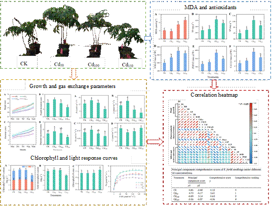 该研究对比考察了格木幼苗在不同浓度镉处理下生长、光合特性和抗氧化活性物质的响应,旨在揭示格木的响应模式和适应性,探究其在植物修复中的潜在作用。结果表明,格木对重金属镉表现出显著的耐受性。在一定的镉浓度下,其生长得到增强,主要特征为根部生物量分配的增加,这归因于光合作用能力的提升。而在较高的镉浓度下,抗氧化活性物质的水平得到提高,是格木对镉胁迫产生生理抗性的重要表现。这项研究揭示了格木在重金属污染土壤中生物治理的潜在应用价值,证明了其作为具有木材经济价值的植物修复候选者的可行性。