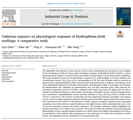 近日,我院杨梅教授科研团队在探究本地树种格木对重金属镉污染土壤的适应性和耐受性上取得重要见解,研究成果以“Cadmium exposure on physiological responses ofErythrophleum fordiiseedlings: A comparative study”为题发表于农林领域国际知名期刊INDUSTRIAL CROPS AND PRODUCTS(农林类期刊排名8/125)。伟德国际VICTOR1946在读硕士研究生陈丽宇作为第一作者,杨梅教授和徐圆圆讲师作为通讯作者,博士后Izhar Ali、良凤江国家森林公园李婷参与了本论文的工作。本研究得到了国家自然科学基金(32371856)等项目的支持。