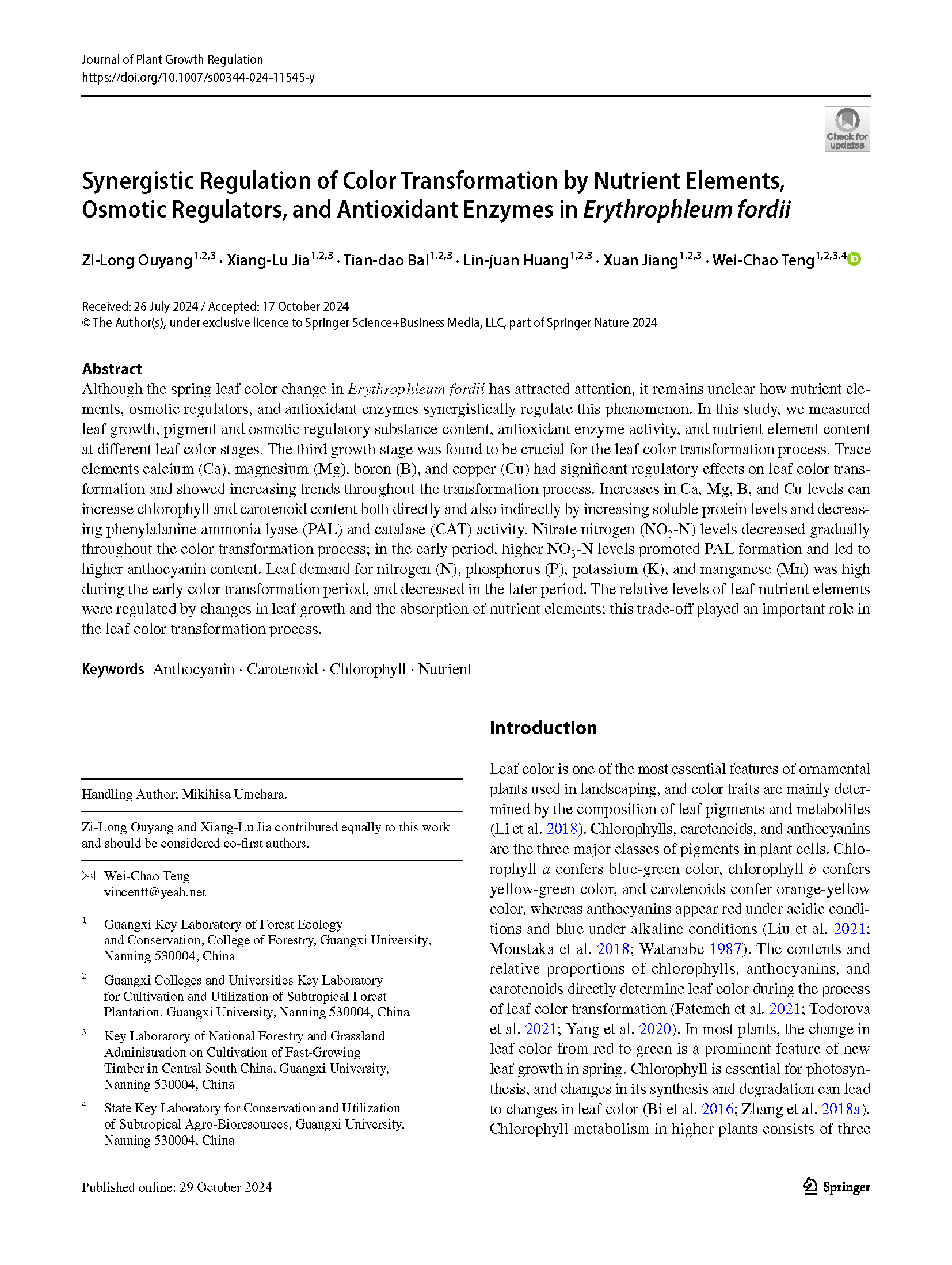 近日,我院滕维超团队在国家二级重点保护植物格木叶色变化机理上取得重要发现,研究成果以“Synergistic Regulation of Color Transformation by Nutrient Elements, Osmotic Regulators, and Antioxidant Enzymes inErythrophleum fordii”为题在国际期刊Journal of Plant Growth Regulation发表。