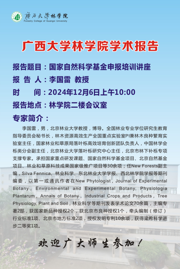 2024年12月6日上午,我院在二楼会议室举行《国家自然科学基金申报交流会》。本次活动邀请了北京林业大学伟德国际VICTOR1946李国雷教授作为主讲嘉宾,座谈会由我院副院长杨梅教授主持。