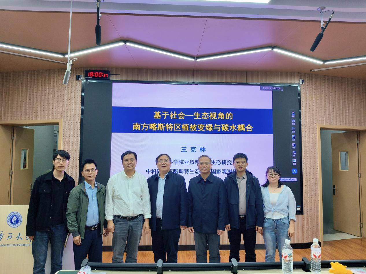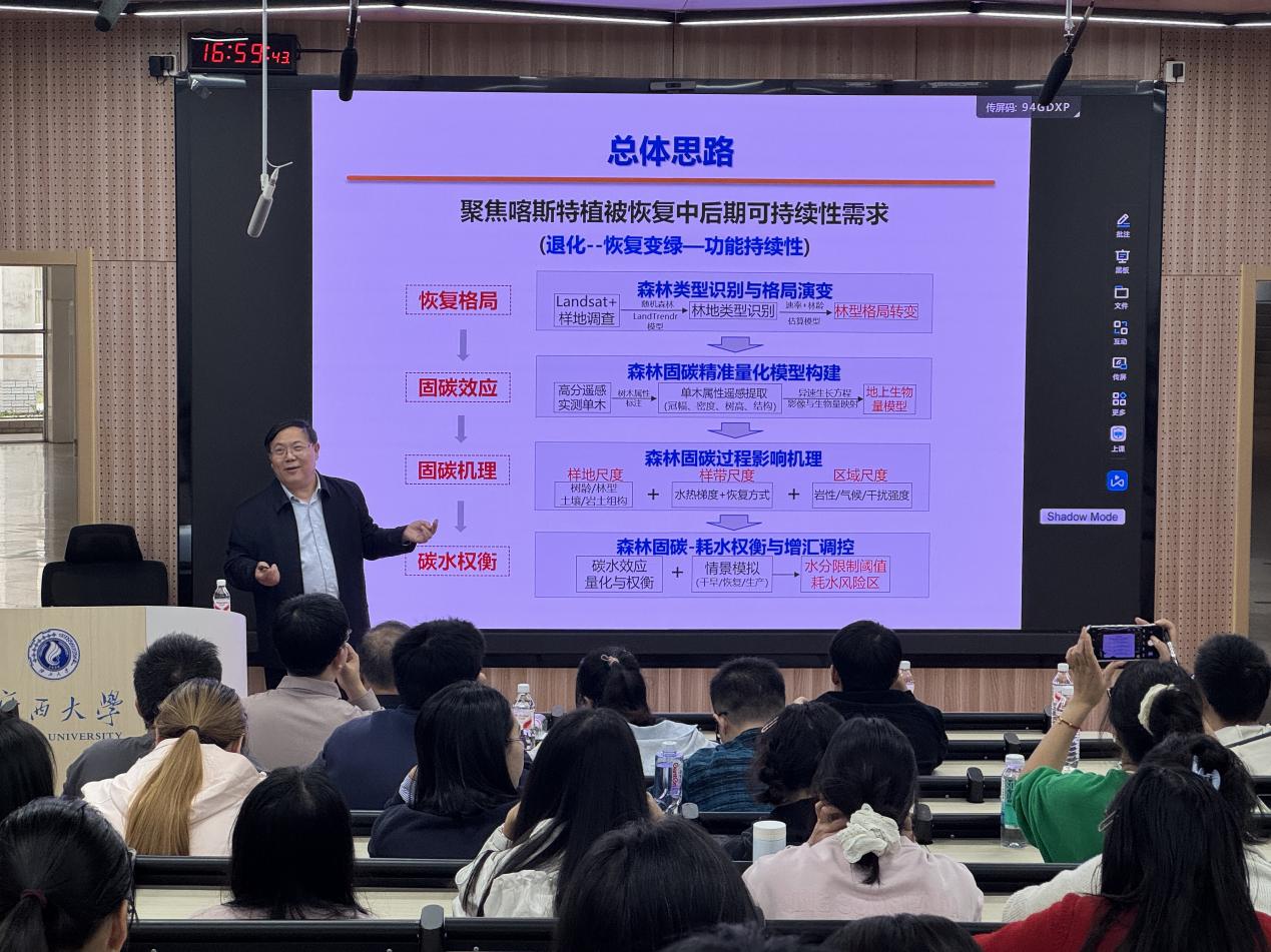 王克林研究员从景观生态学研究范式的转变切入,系统阐述了在全球变化背景下,南方喀斯特地区植被变绿的趋势、驱动机制及其对森林固碳能力的影响。他指出,尽管植被恢复显著提升了区域碳汇能力,但也伴随着水分消耗加剧、土壤干燥化、养分限制等新问题,植被恢复的“持续性”与“稳定性”成为当前生态修复面临的核心挑战。