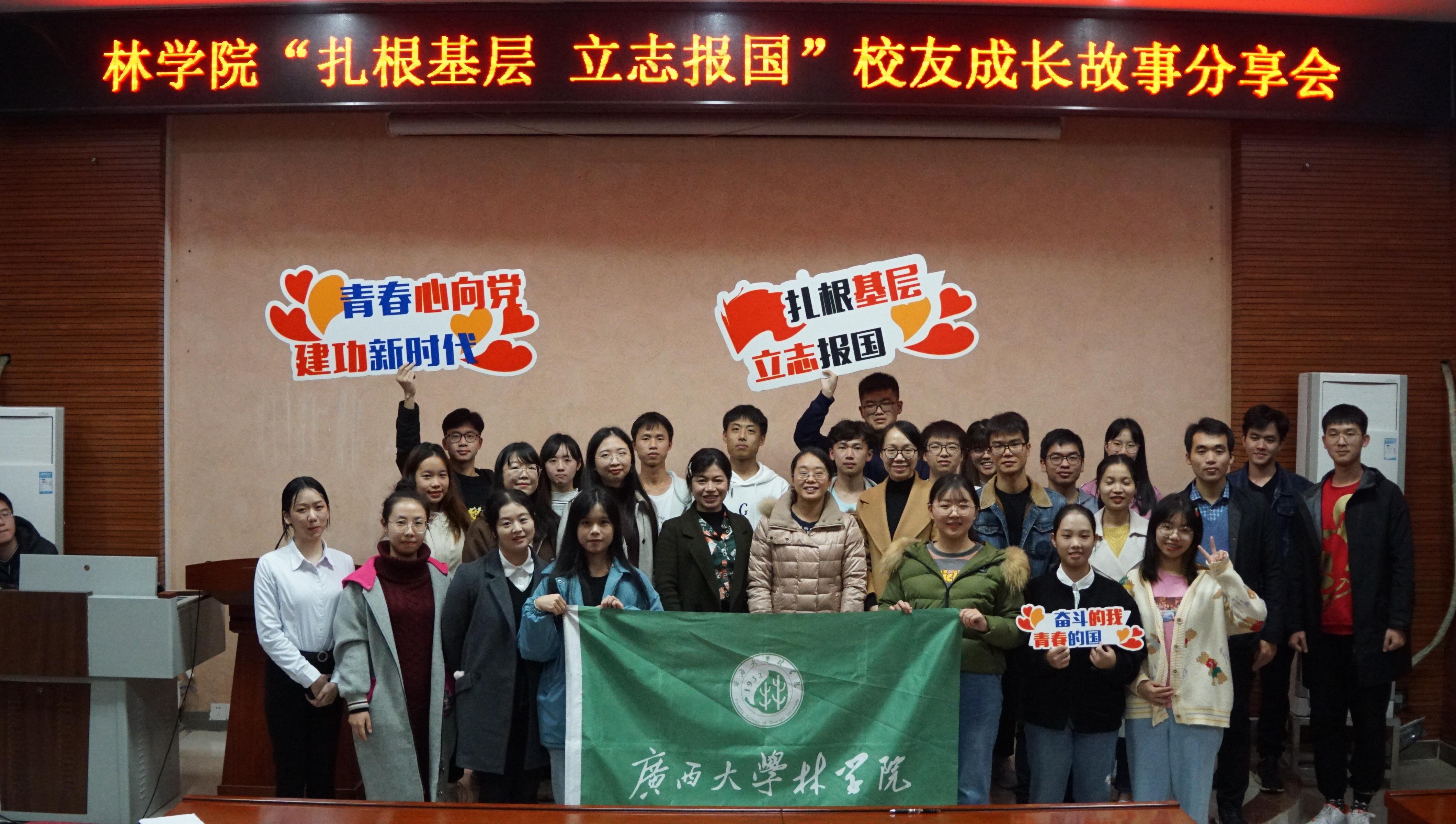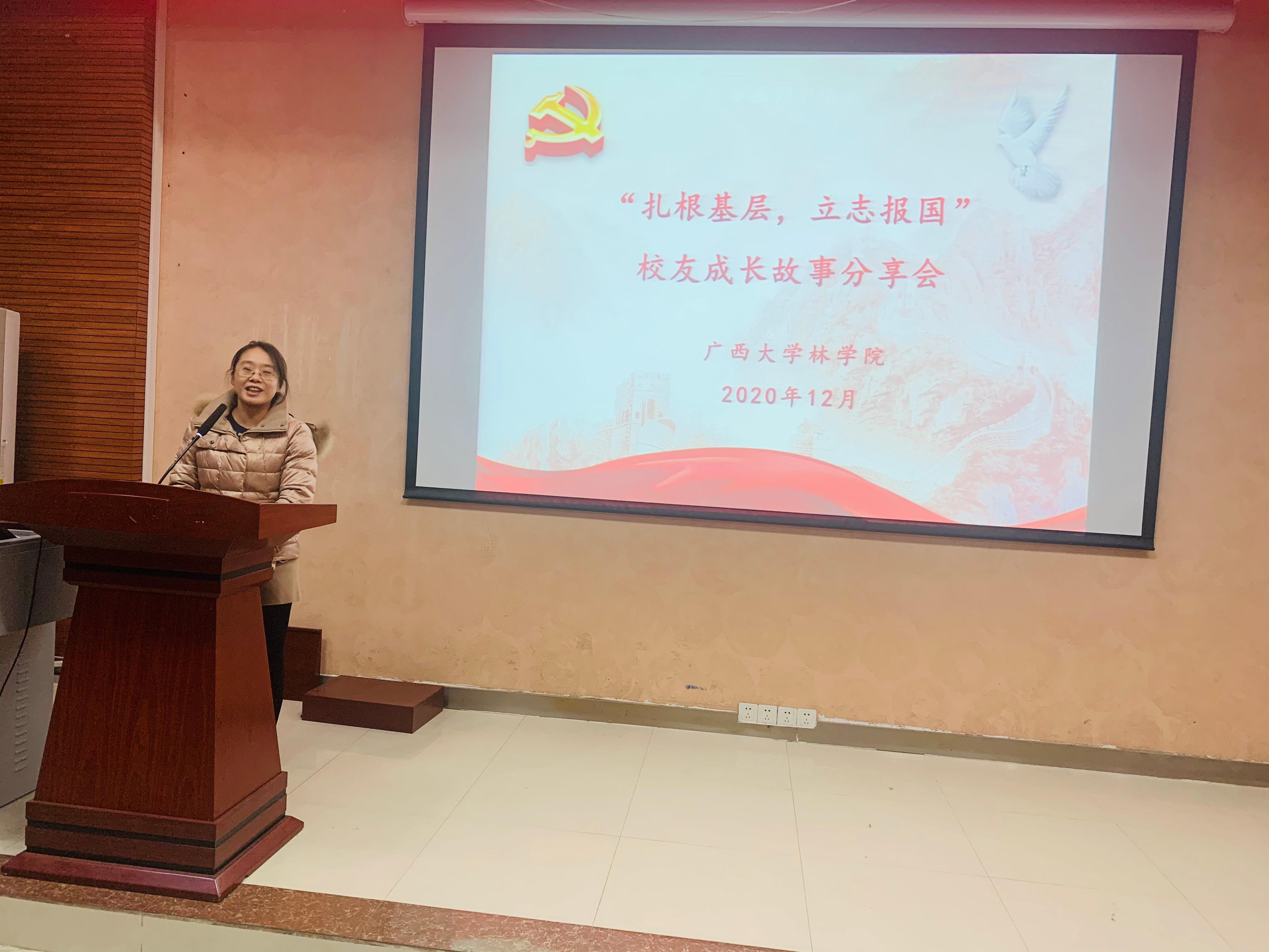 为鼓励林苑学子扎根基层,勇担强林兴林使命,12月26日伟德国际VICTOR1946在学院112教室举办了“扎根基层,立志报国”主题校友成长故事分享会。我院黄超群、周江悦、谭诗蓓、申庆海和黄瑞琛五位扎根基层优秀青年校友作为嘉宾分享成长故事。院党委副书记徐丽、院团委书记银宁、院团委副书记马奕、院辅导员李琼莹、孙静以及学生代表100余人参加分享会。