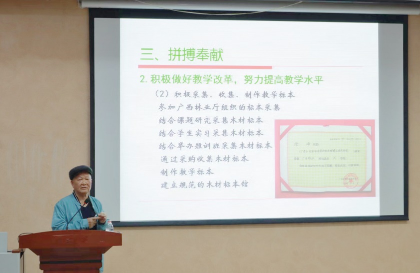紧接着,被新闻媒体誉为“木材鉴定行业的福尔摩斯”的徐峰教授结合自己的亲身经历,饱含激情地从家风讲起,用自己的日常向同学们描述他朴素节俭的生活,提到对他影响很大的老师与亲友,他目光真挚,用简单的语言传达殷殷教诲,并告诉同学们他最为看重的品质就是“为人诚实”,告诫学生们:“诚实做人,认真做事才会有出息”。虽然徐峰老师已经退休多年,但作为现任伟德betvlctor1946源于英国教学督导团成员,仍积极为学校出力,为社会服务。讲到情深处,徐峰老师向师生们展示他所获得的荣誉奖牌,并讲述了这些奖牌背后蕴含的优秀事迹。最后,徐峰老师把“拼搏精神”送给大家,鼓励同学们积极参加进修学习,努力打牢理论基础。