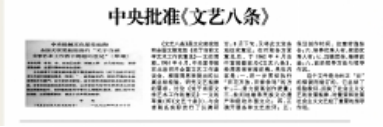 1962年4月30日,中共中央批准《关于当前文学艺术工作若干问题的意见(草案)》(简称《文艺8条》),内容包括,贯彻执行百花齐放,百家争鸣的方针;正确地开展文艺批评;批判地继承民族遗产和吸收外国文化;改进领导作风;加强文艺界的团结等。